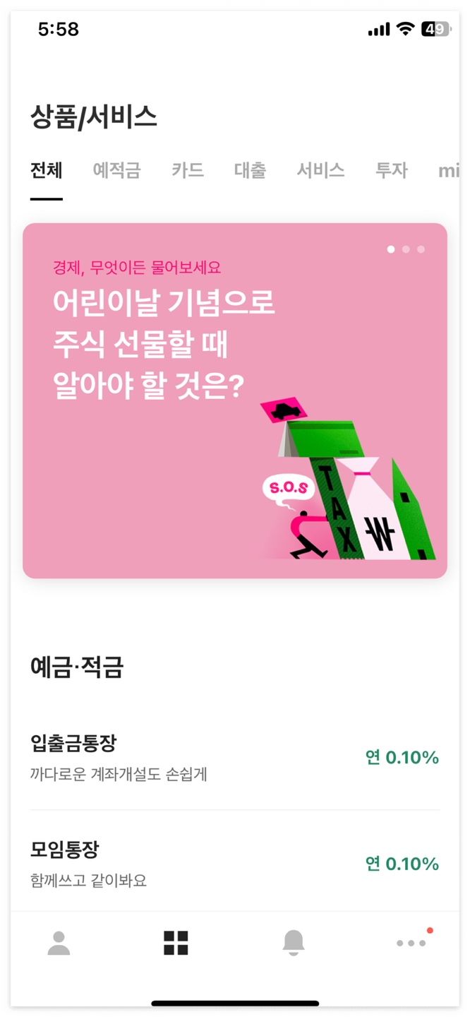 1. 상품/서비스의 예적금 카테고리에서 입출금통장을 개설한다