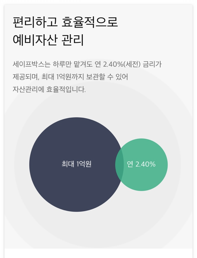 여유자금을 세이프박스에 넣어두고 필요할 때마다 넣기 빼기로 하루이자 수익을 얻으면서 편하게 사용이 가능합니다.